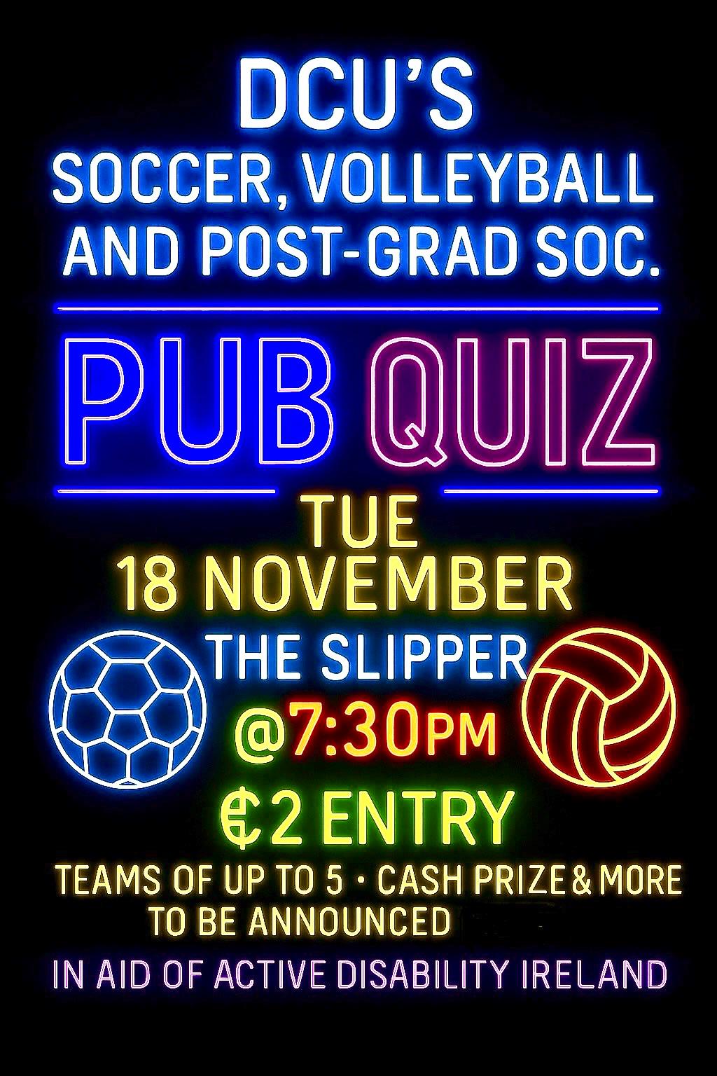 DCU Soccer society will host a pub quiz at the Slippers with DCU volleyboll and Post grad society. The Pub Quiz will take place on the 18th of November between 7:30 pm until 9:30 pm. The tickets costs 2 euros per person.