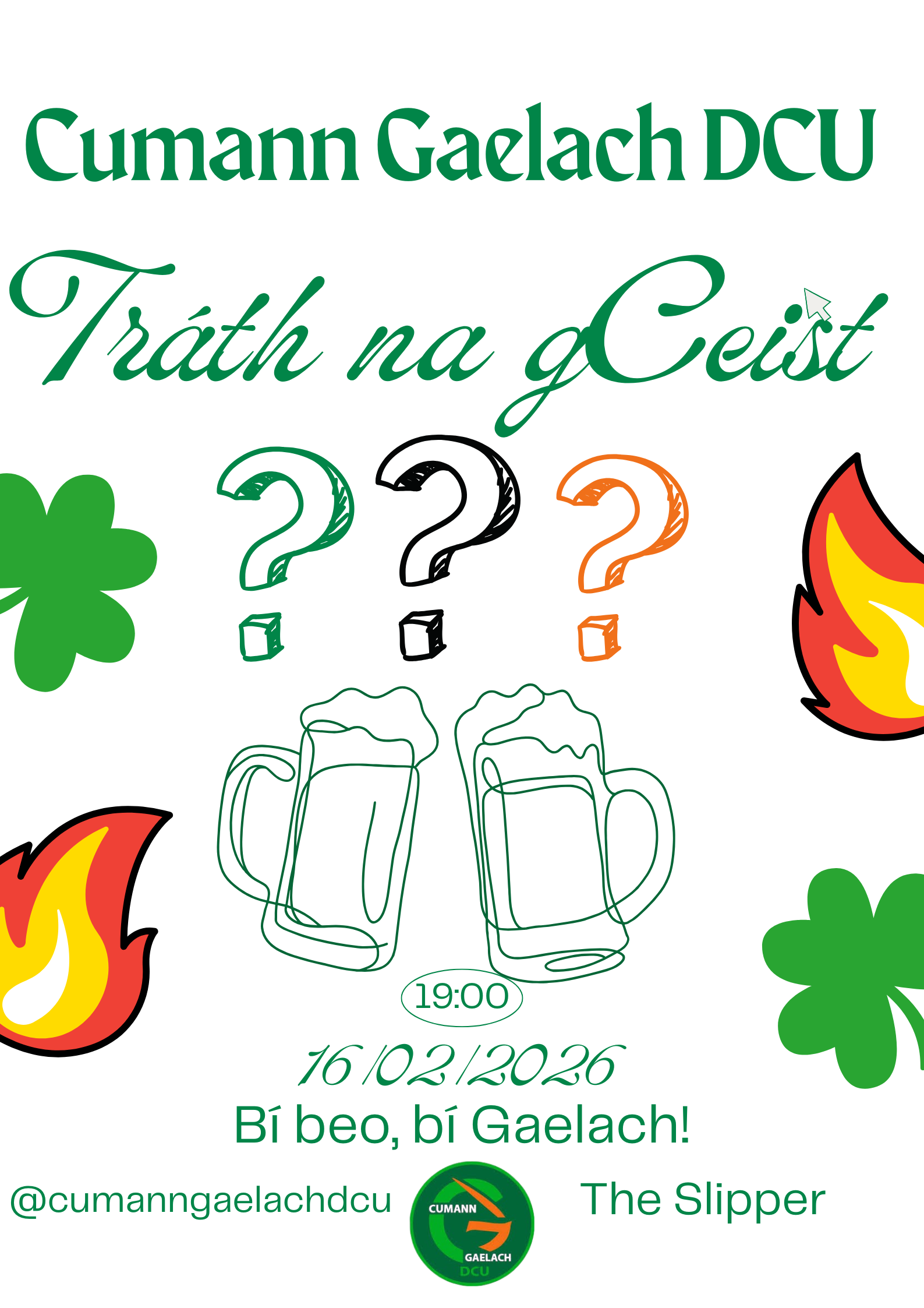 We are the Irish language society in DCU, open to speakers of all levels - Maybe you want to add your cúpla focal in a social setting, well there's not better way! Más Gaeilgeoir líofa thú agus tá ag cuartú áite chun an teanga a úsáid go rialta, tá tú san áit cheart!