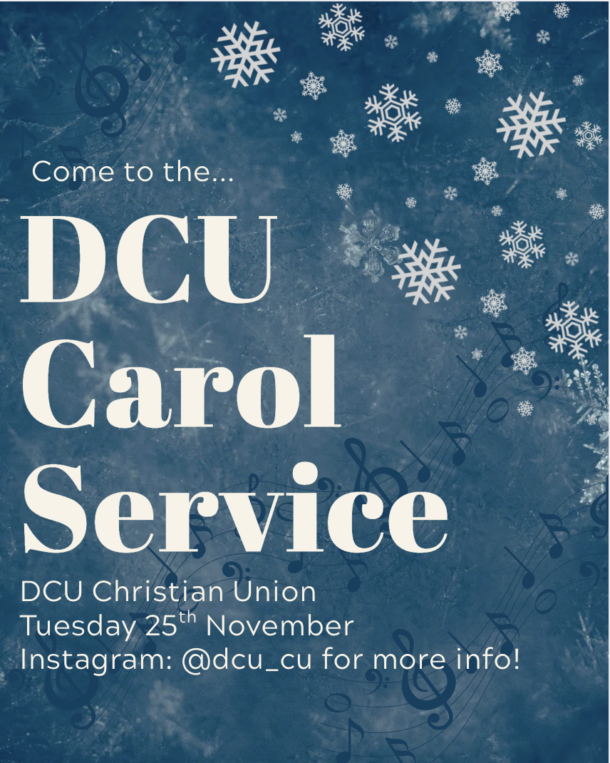 DCU Christian Union will host a carol service for students and staff on campus. There will be time for singing carols and hearing a short Christmas message from our speaker. It will run from 6:30 onwards. It is a free event for both students and staff to attend.