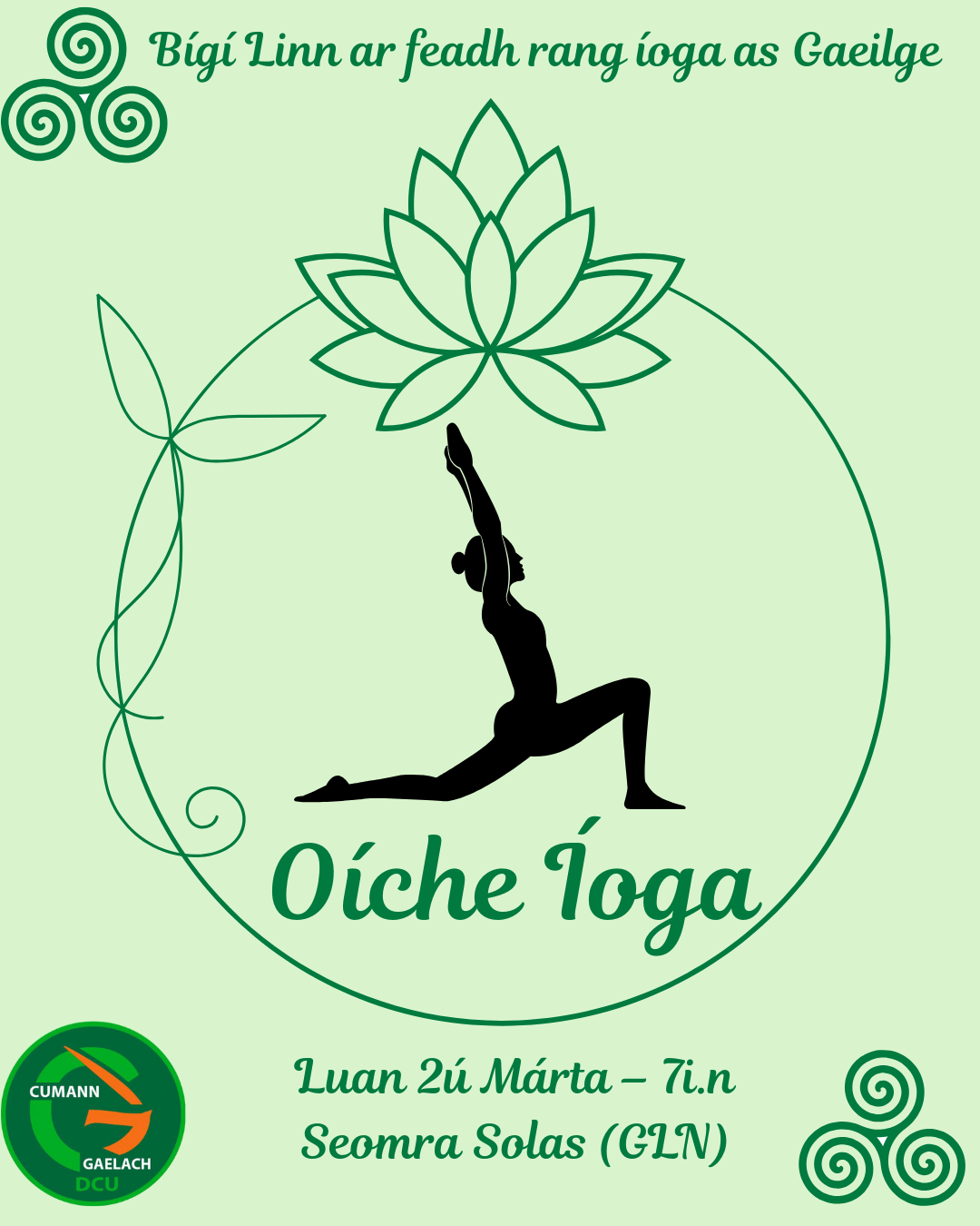 We are hosting a beginners Yoga class through Irish with Yoga society, We have a trained instructor who is fluent in Irish who will be giving all instructions through Irish & English. This event will last 2 hours and be held on the Glasnevin Campus