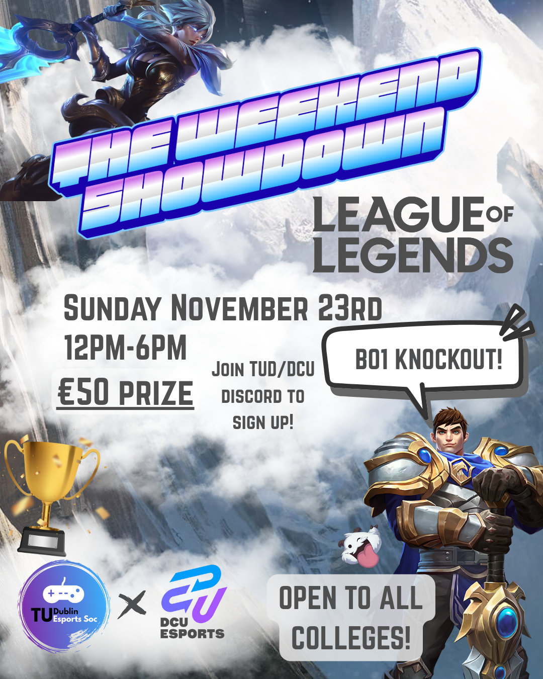 TUD and DCU Esport societies are collaborating to host a League of Legends Tournament open to ALL college students!