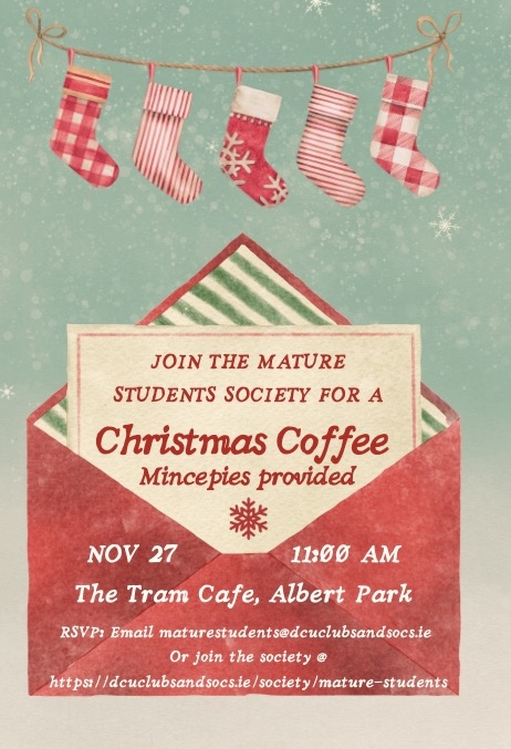 Just an informal meet-up of mature students in the Tram Cafe, Albert Park. People provide their own coffee but the society is providing mince pies (sponsored by the DCU Access Support Office, so no cost to society).