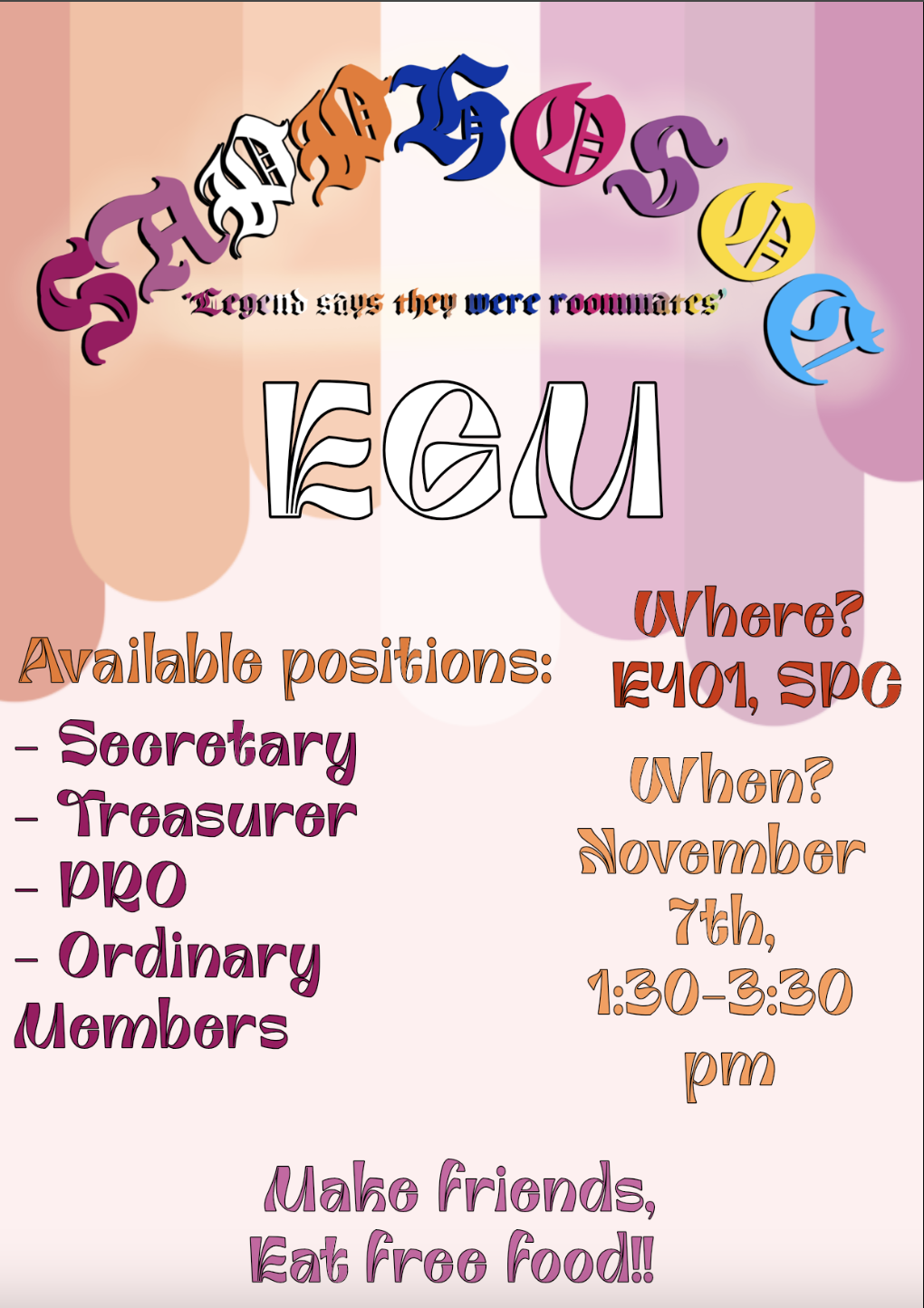 At this meeting, we intend to elect our full committee and discuss future event ideas with members. Giving more people the opportunity to join on the spot or take away the info they need to make their decision on joining. The committee will provide pizza for attendees and explanations for each position including their responsibilities when elected. If more than one person wants to be in the same position, an anonymous vote will take place (drawing names from a hat)