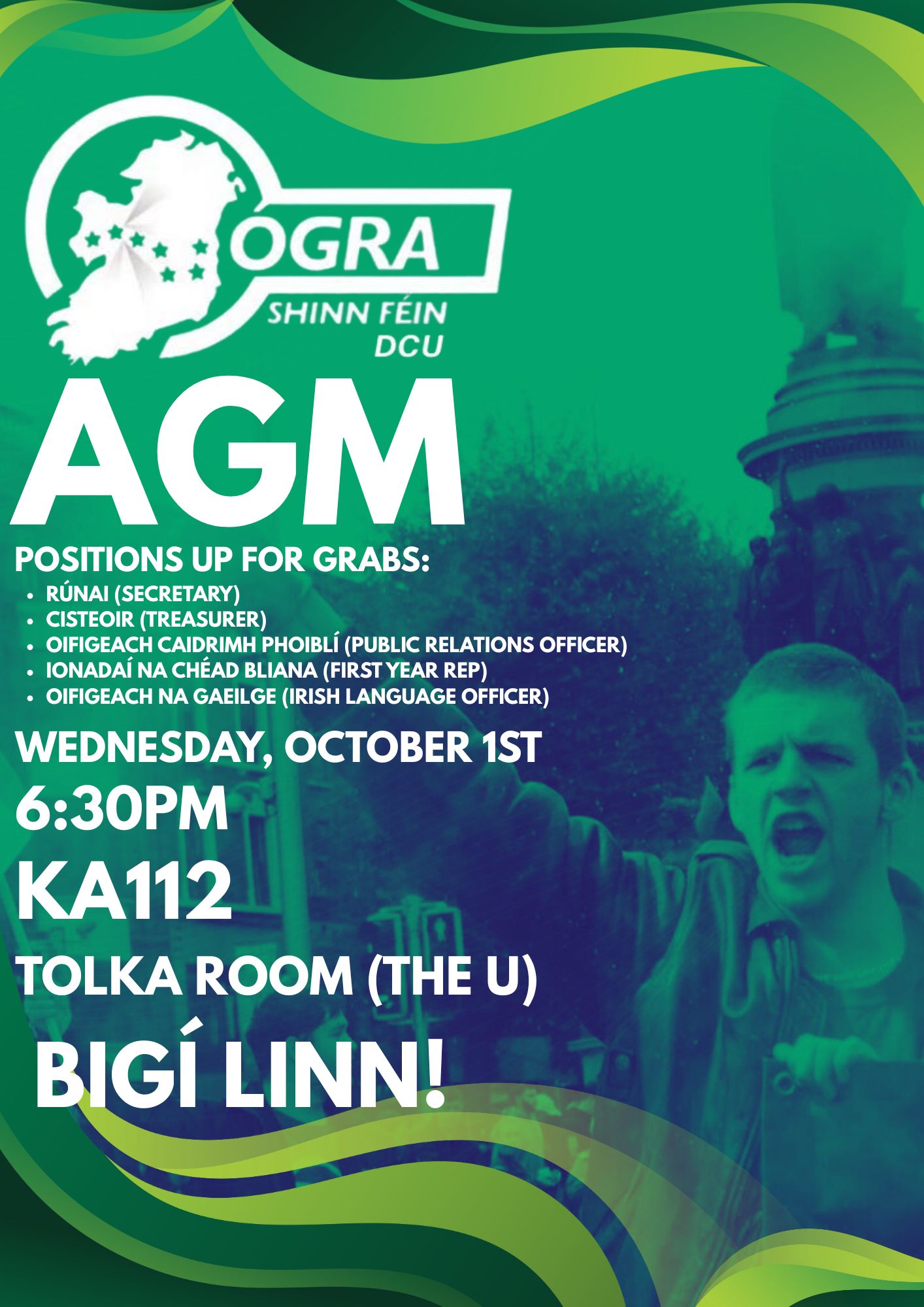 Ógra Shinn Féin is a movement for young people, led by young political activists. Our role is to campaign, educate and to build a project that creates a political space for progressive young people. Our political campaigning is based around five ideas: National liberation, socialism, feminism, internationalism, environmentalism. We are the youth wing of Sinn Féin, free to set an independent agenda.