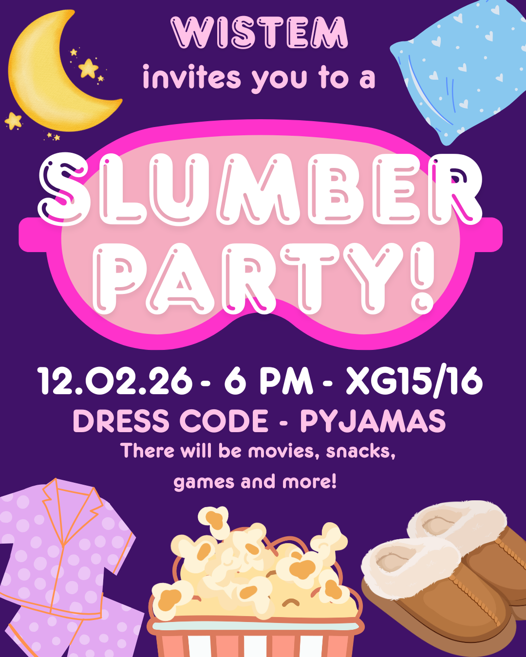 The Women in STEM Society Slumber Party is a fun, welcoming, and relaxed evening designed to bring members together outside of an academic setting. With cozy vibes, games, movies, snacks, and plenty of laughter, the event creates a safe space for students to unwind, make new friends, and strengthen connections across different STEM disciplines. More than just a social night, the slumber party fosters a sense of community and support, encouraging collaboration and confidence among women pursuing STEM fields.
