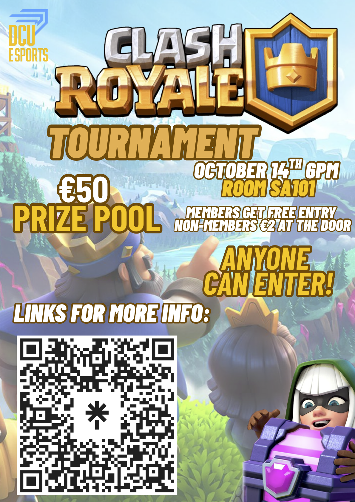 "Esports Society is holding DCU’s first ever Clash Royale Tournament!Get ready to battle it out in the popular mobile game Clash Royale against other students in our in-person tournament, for a chance to win a cash prize! There will be first, second and third place winners, with a prize pool of €50! Esports Society Members gain free entry, non-members will pay €2 at the door that will contribute directly towards the prize pool. This tournament is open to all members of DCU. Any skill level is allowed. We invite you to bring your friends!"