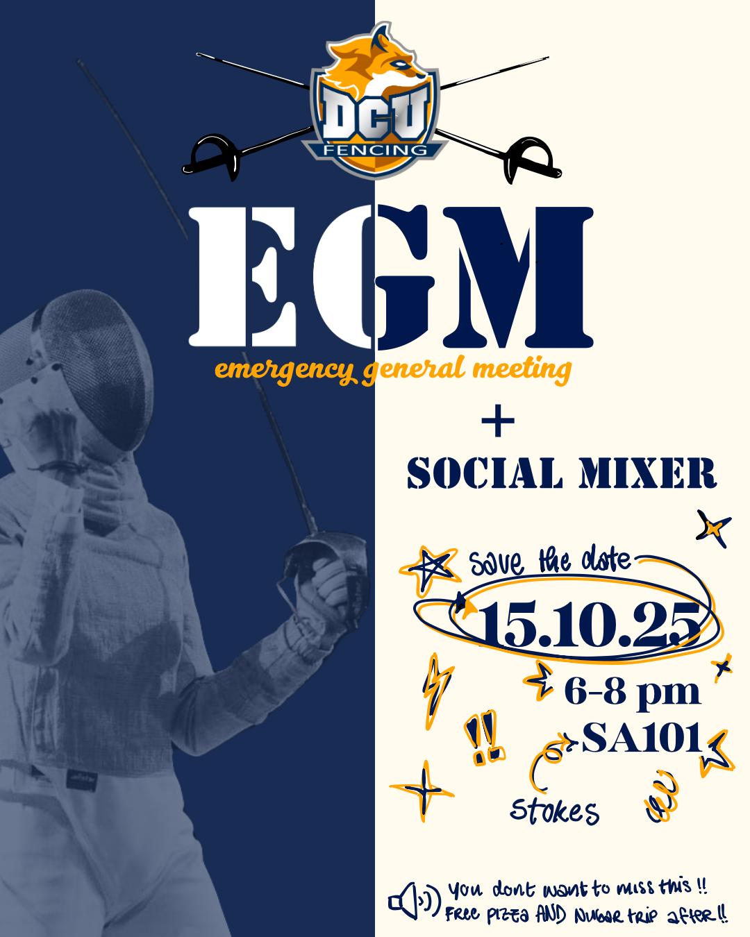 "Hi Everyone and welcome to DCU Fencing Club. On the 15th of October from 6-8 we’ll be holding our Extraordinary General Meeting (EGM). We’ll introduce the current committee, vote in some new members, share plans for the year and have some fun along the way. Afterwards we are going to Nubar to get to know each other a bit. Everyone is welcome regardless of if you plan to run - and we’d love to see new faces get involved! Here's a quick description of the roles:* Health & Safety Officer: keeps our sessions safe and makes sure everyone’s bout runs smoothly * Beginner Liaison Officer: the first point of contact for new fencers, making sure nobody feels like they’re fencing blind * Events Officer: plans socials and competitions * Alumni Officer: keeps past members in the loop and builds connections * Ordinary Committee Member: helps wherever needed, always ready to lend a blade * First Year Rep: gives our newest fencers a voiceWe will also have an option to so you can join us through a Zoom call. If you have any other questions or cannot make it, feel free to reach out and we will sort somthing out. Can't wait to see you all there! ?"